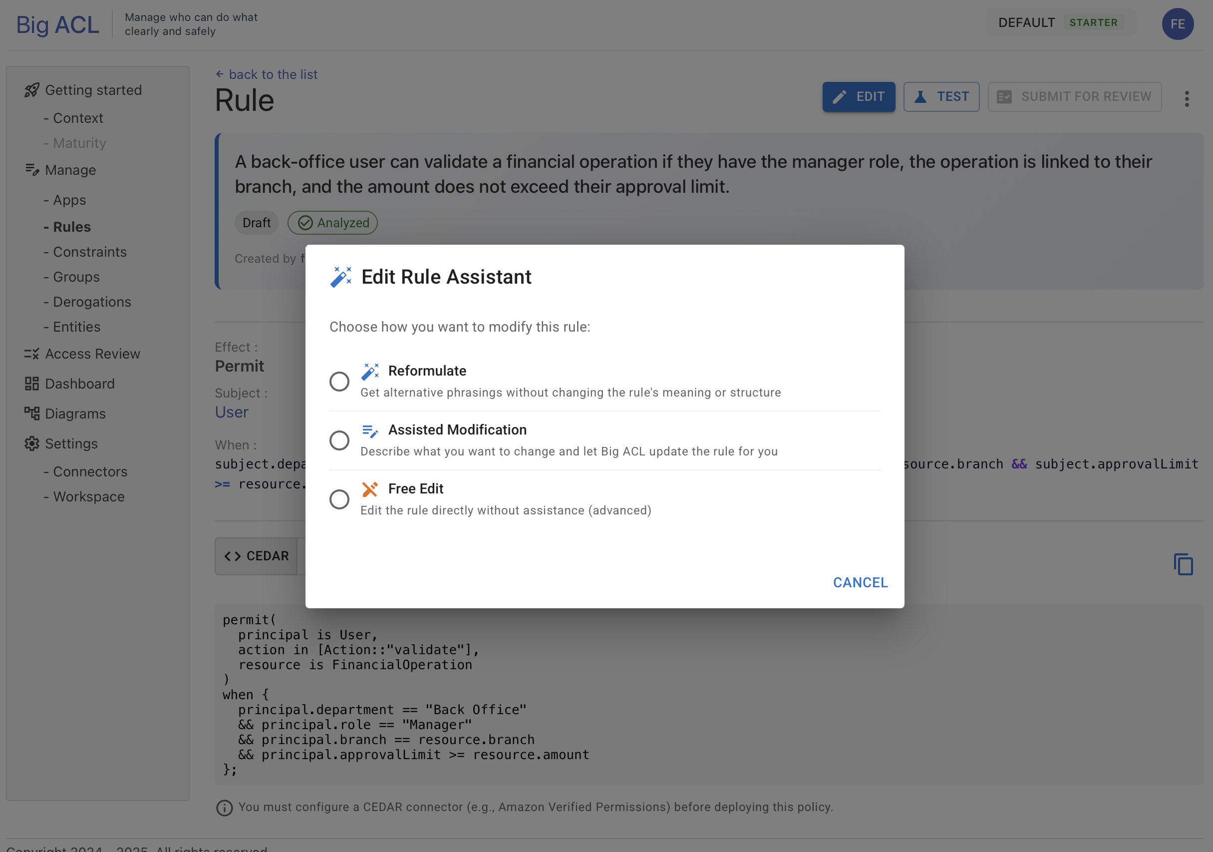 Section titled “Assisted Modification”Describe what you want to change in natural language, and Big ACL will update the rule for you. Examples: