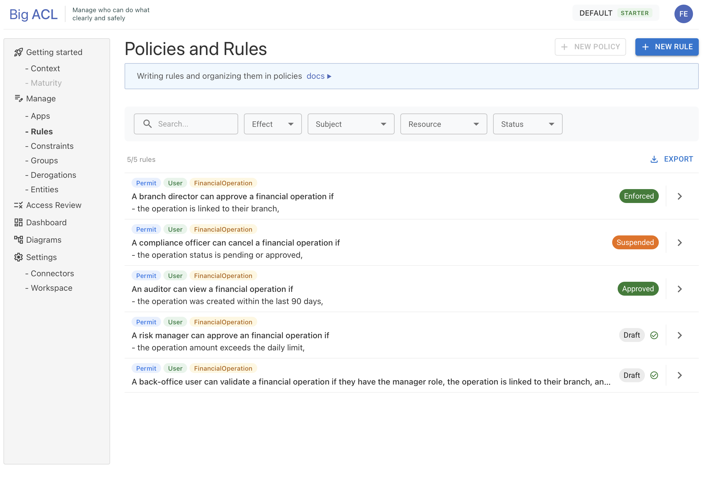 Section titled “Getting Started”- Navigate to Policies and Rules in the Big ACL console